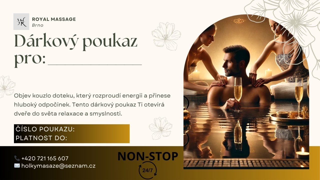 Dárkový poukaz na erotickou masáž k nám je vstupenkou do světa, kde se nepospíchá, nedívá se na hodinky a neřeší se nic jiného než pocit.