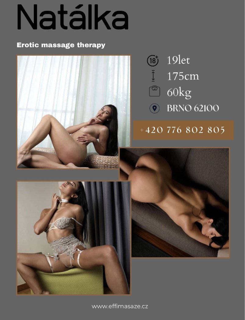 Jsem mlaďounká slečna Natálka a ráda ti zpříjemním den dotekem, na který nezapomeneš. V masážích jsem profesionálka, po mojí masáži, která je opravdu velmi intenzivní budeš odcházet krásně uvolněný a s úsměvem. Jsem si jistá, že se budeš rád vracet.