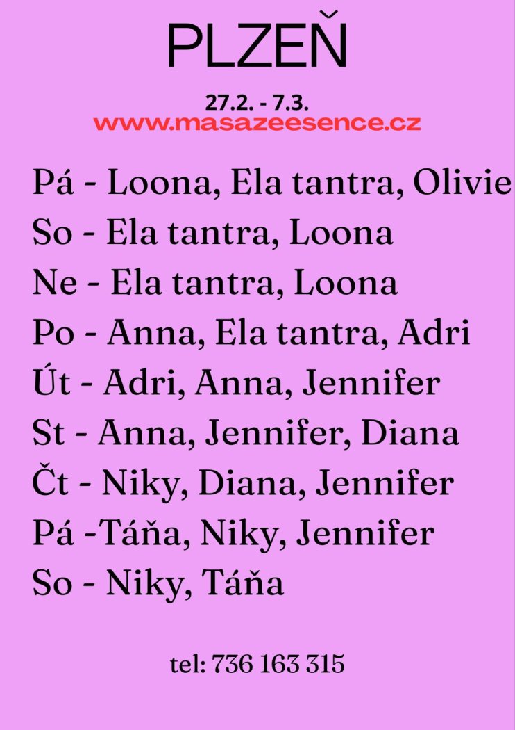 Vítám vás v salonu MASÁŽE ESENCE Jsem SMYSLNÁ dívka co vás ráda potěší... JEDNÁ SE O EROTICKOU MASÁŽ S RUČNÍM VYVRCHOLENÍM. Je to velice hravá a intimní masáž do které zapojím nejen své ruce, ale i stehna, zadeček i prsa. Extra masáže: BDSM, KOUPACÍ RITUÁL, ZPĚTNÁ MASÁŽ A DALŠÍ. MASÍRUJI CELÁ NAHÁ. Pro více informací volej: 736163315. DOPORUČUJI: délku masáže 60min. a z důvodu hlubšího prožitku 90min.